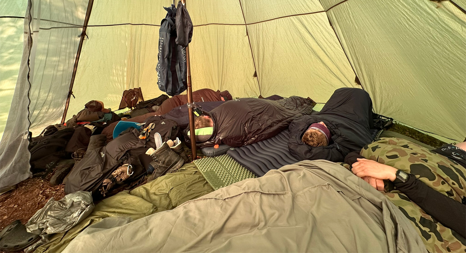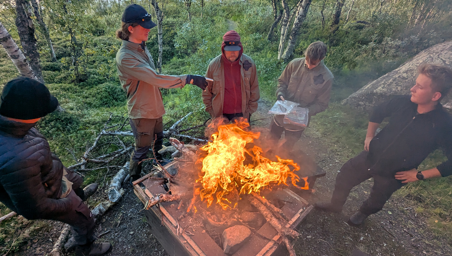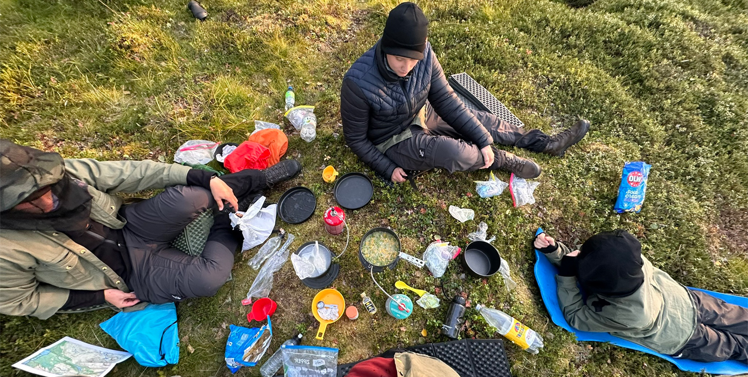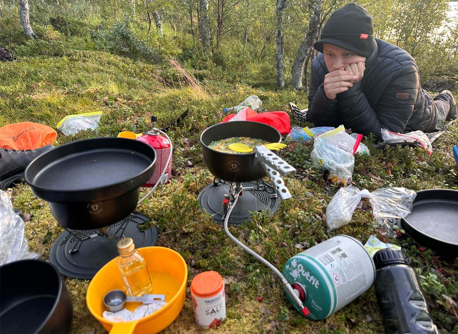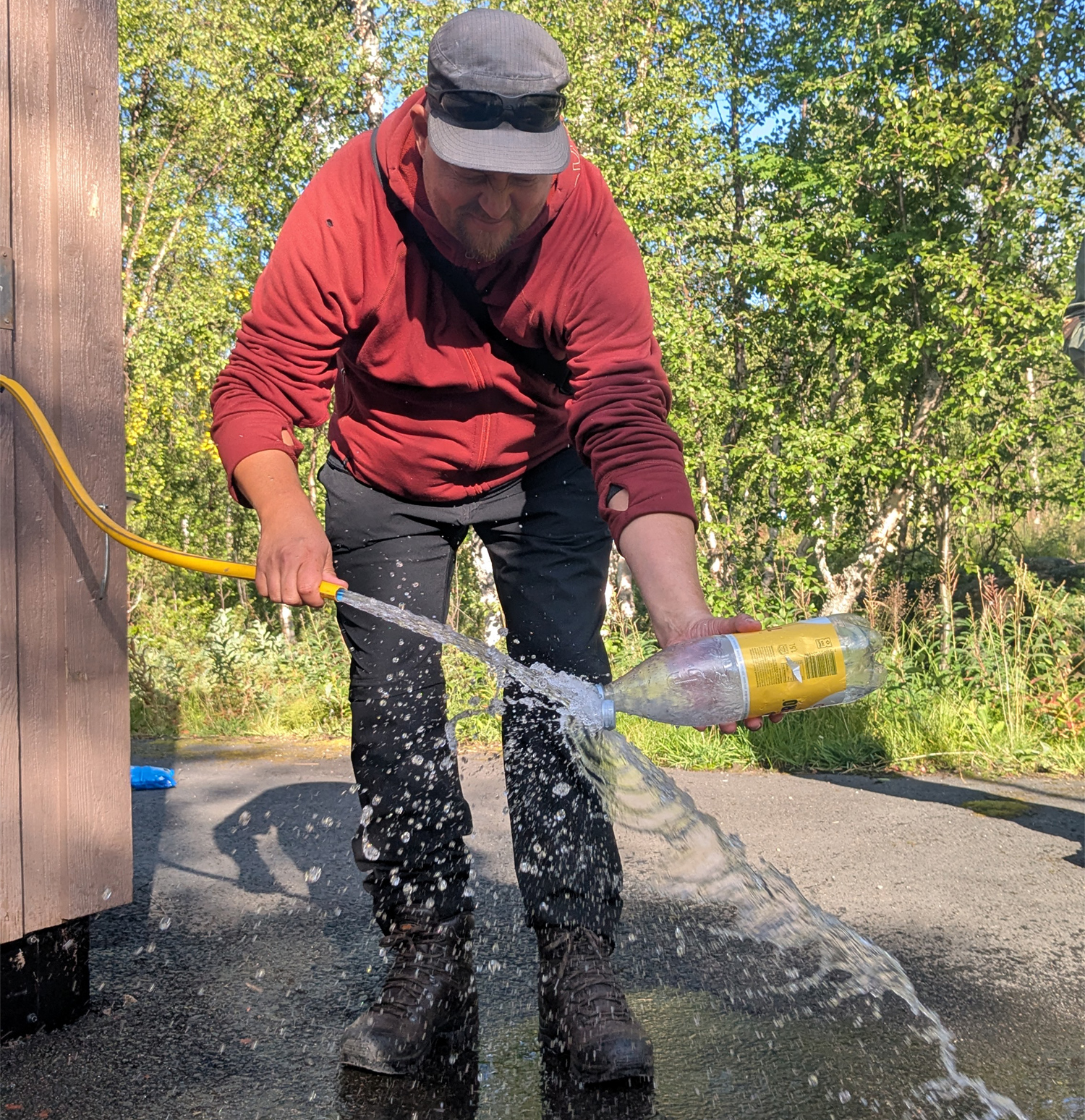 Här ska vi precis hälla i varmt vatten i våra flaskor för att värma upp våra sovsäckar.